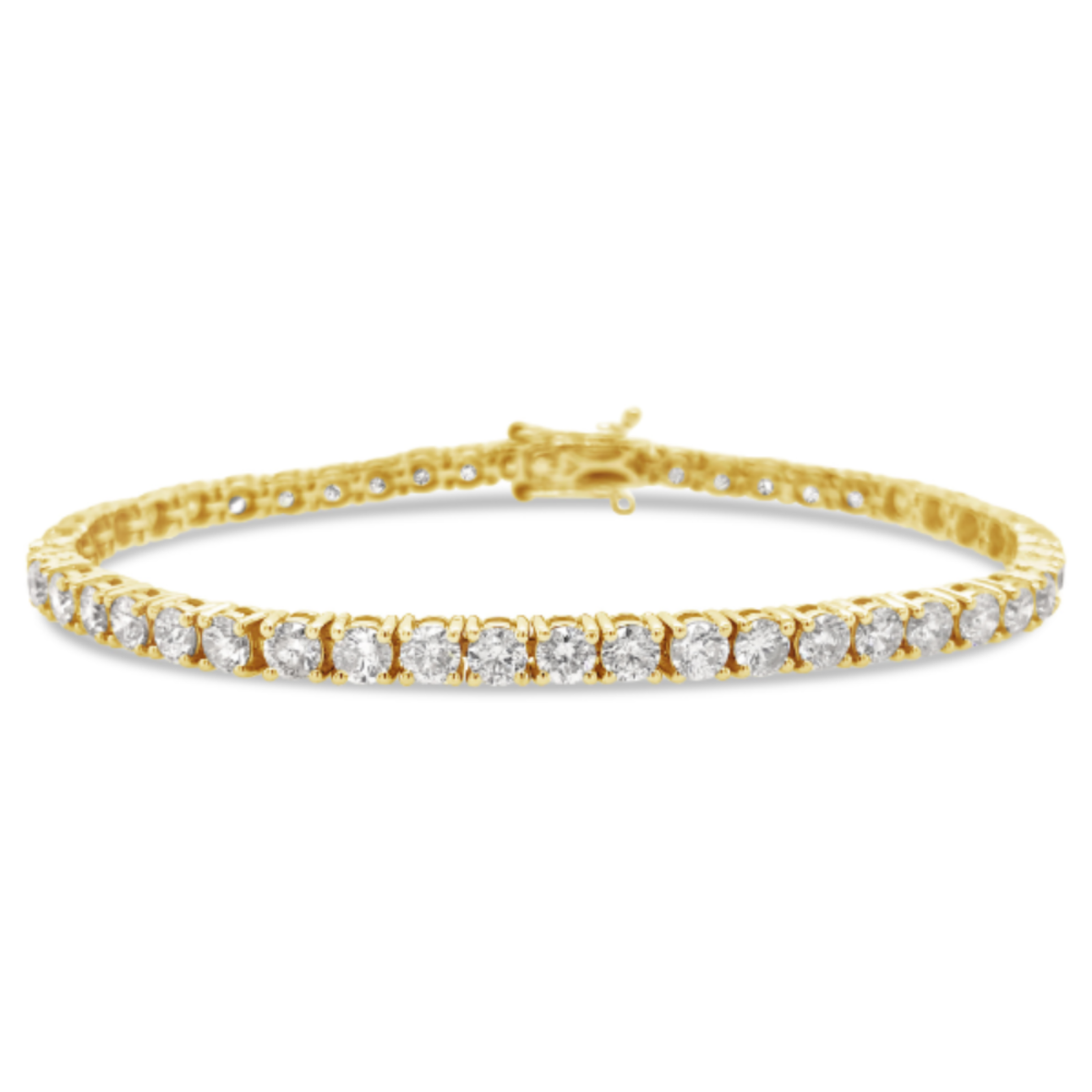 Introducing our classic tennis bracelet, adorned with 5.00CT of premium quality diamonds set in 18K white gold. This exquisite piece exudes glamour and adds a captivating touch to any ensemble. The dazzling round-cut diamonds shimmer within their 18K yellow gold claw settings, creating a mesmerising effect. Whether for a special occasion or a thoughtful gift, this breathtaking bracelet is sure to leave a lasting impression.