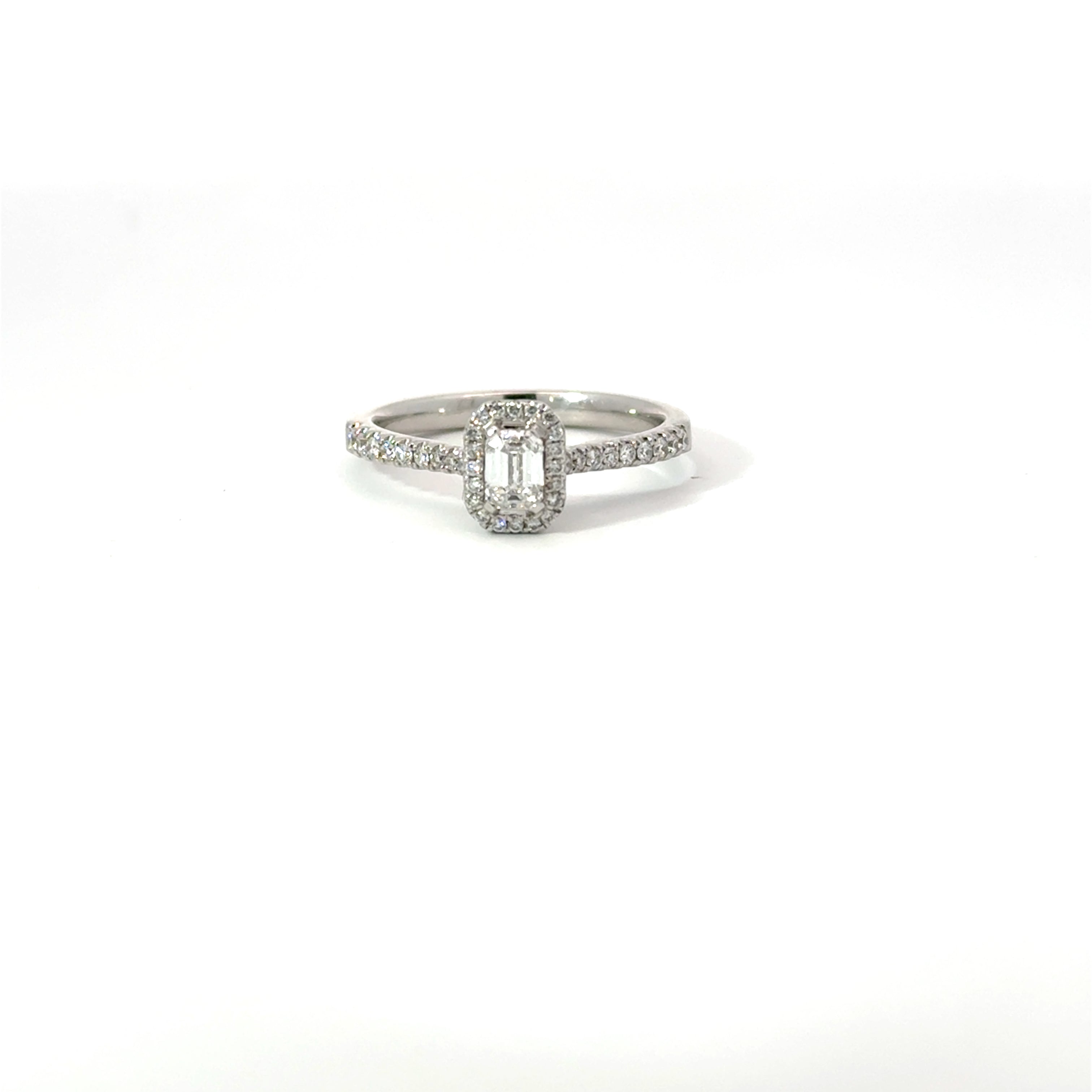 Discover timeless elegance with our Emerald Cut Halo Engagement Ring, featuring a 0.30ct D VS2 GIA certified diamond. Handcrafted in platinum, the halo of round brilliant diamonds enhances its sparkle, creating a sophisticated and radiant design.