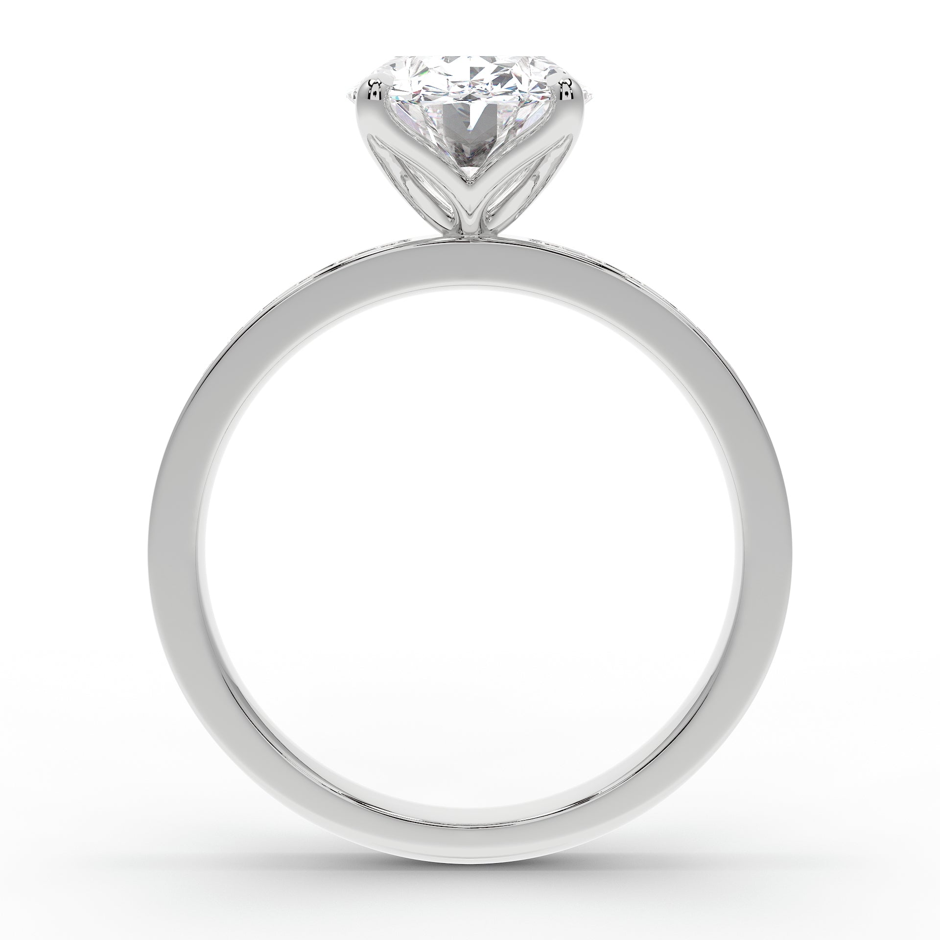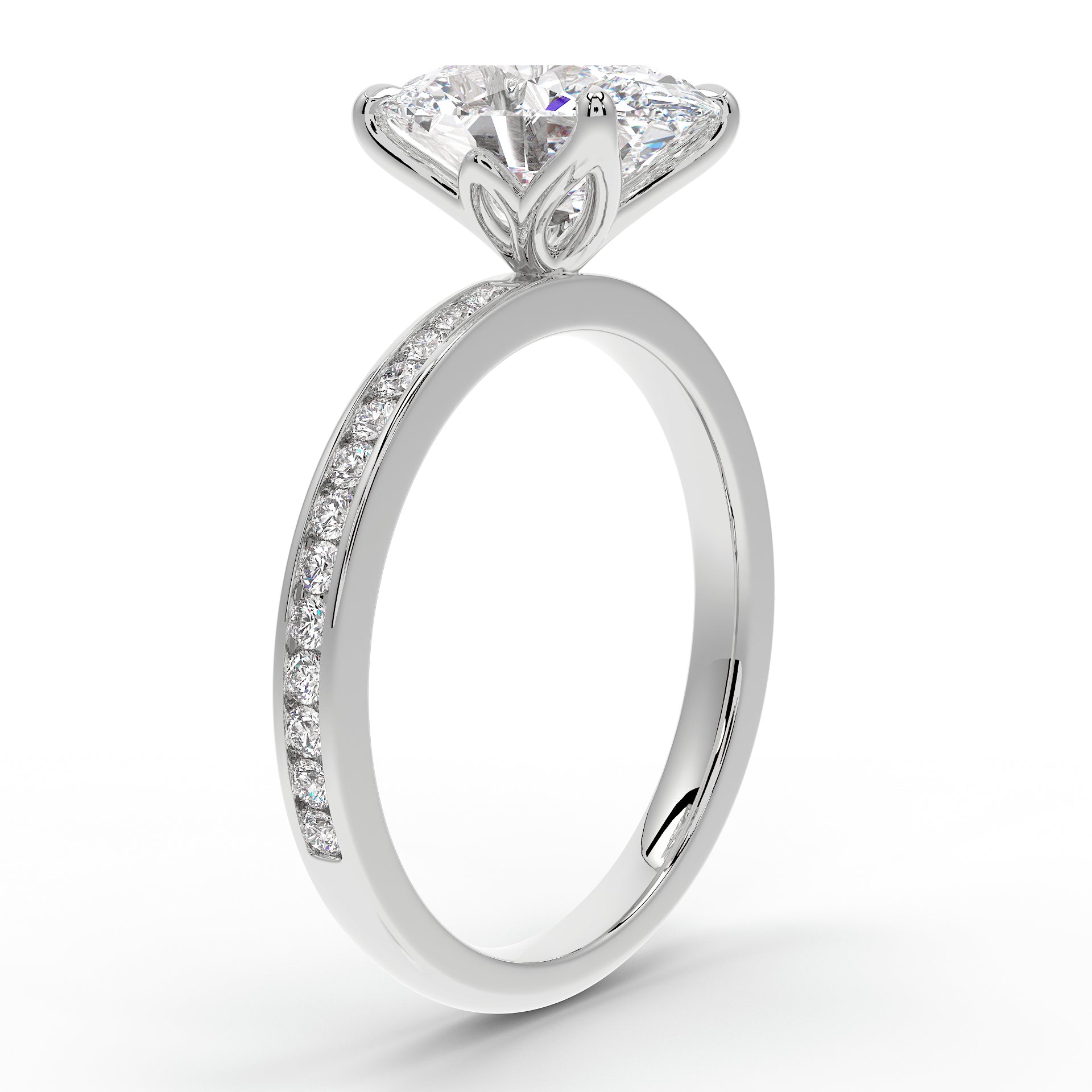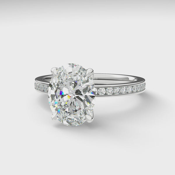 Introducing The Flora Channel | Oval Cut Diamond Ring, a beautiful fusion of natural elegance and timeless sophistication. This exquisite ring showcases a cushion-cut diamond, elegantly set in a classic solitaire design with petal-inspired details that gracefully frame the diamond. The band is adorned with channel-set diamonds along 60% of the shoulders, adding an extra layer of sparkle and refinement. Key features include a delicate petal motif, channel-set diamond shoulders, and a classic solitaire setting.