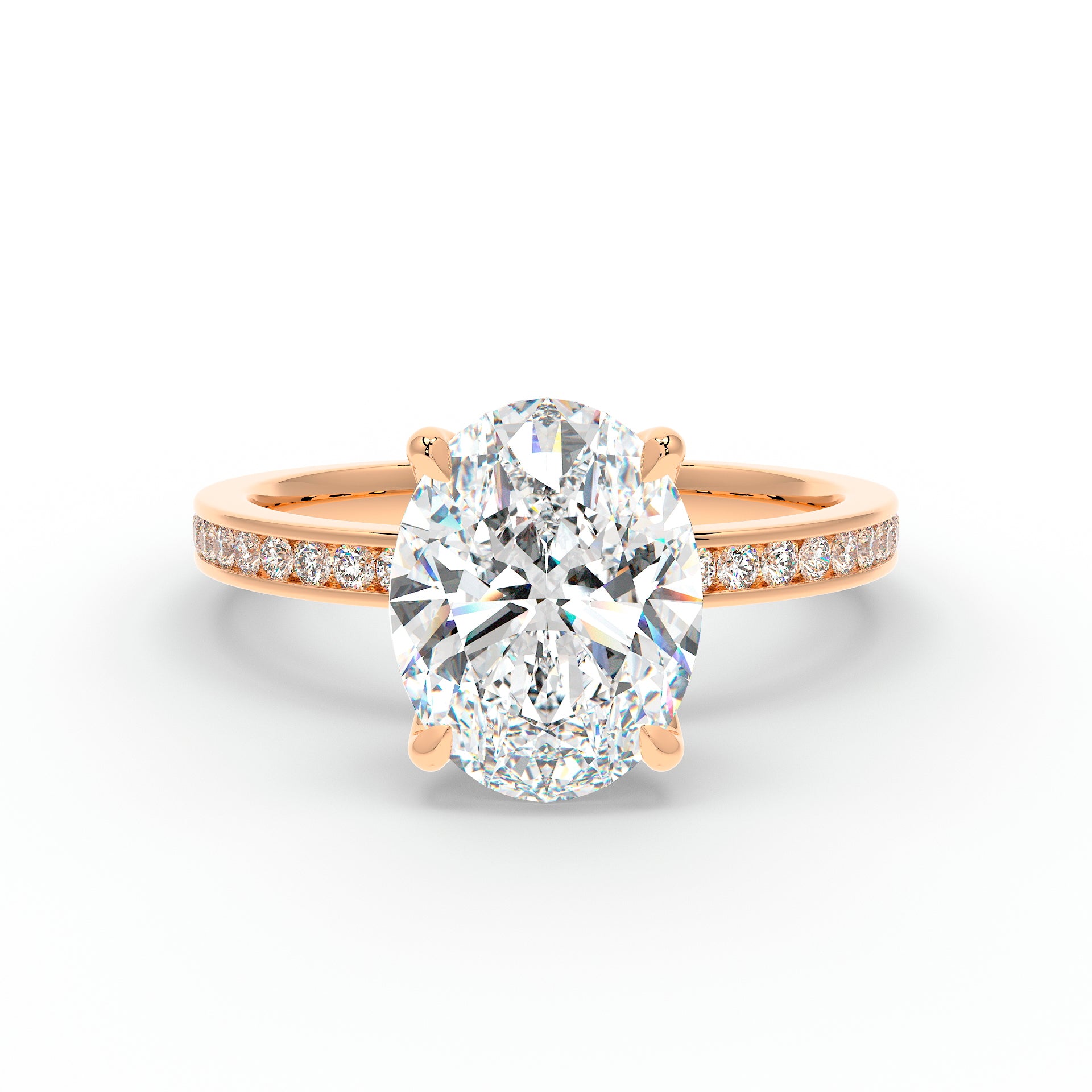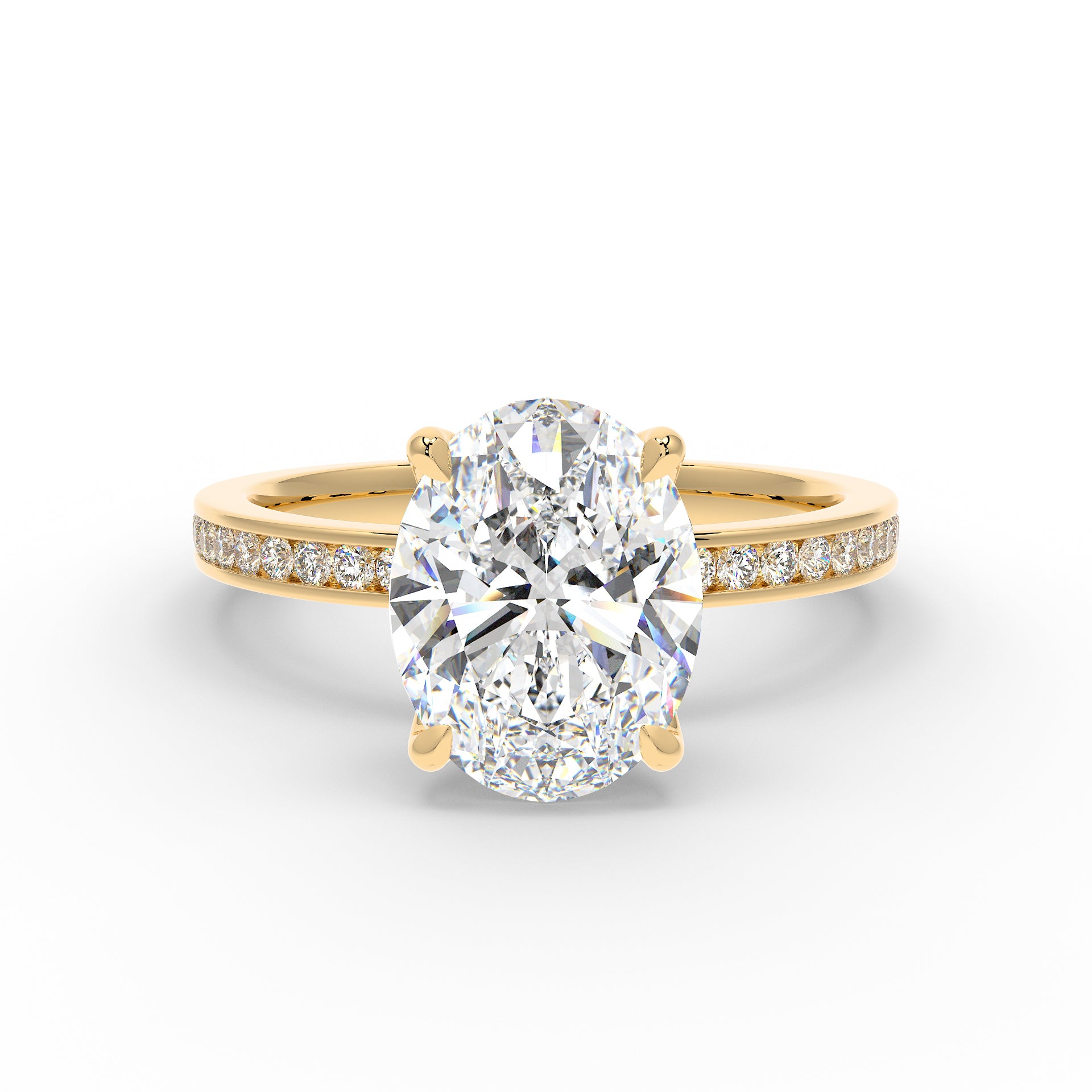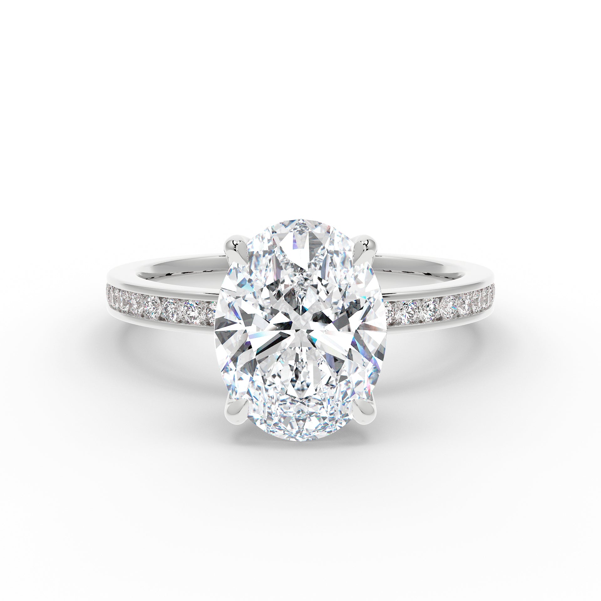Introducing The Flora Channel | Oval Cut Diamond Ring, a beautiful fusion of natural elegance and timeless sophistication. This exquisite ring showcases a cushion-cut diamond, elegantly set in a classic solitaire design with petal-inspired details that gracefully frame the diamond. The band is adorned with channel-set diamonds along 60% of the shoulders, adding an extra layer of sparkle and refinement. Key features include a delicate petal motif, channel-set diamond shoulders, and a classic solitaire setting.