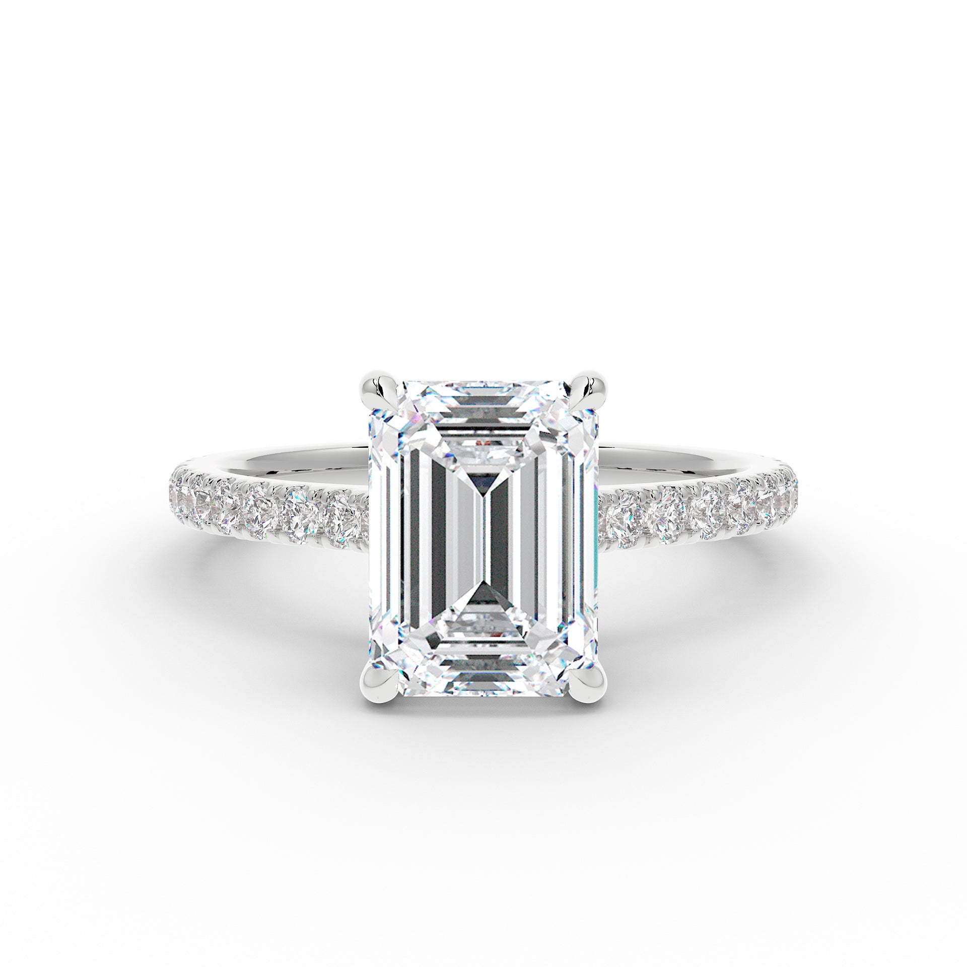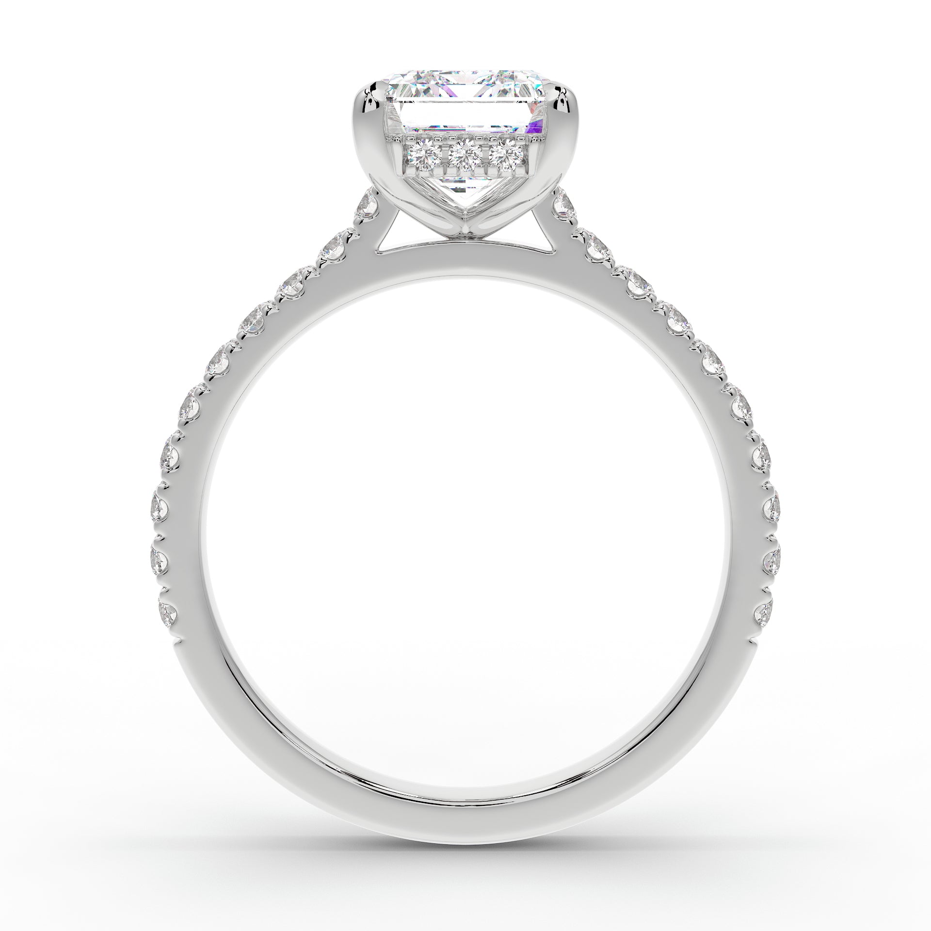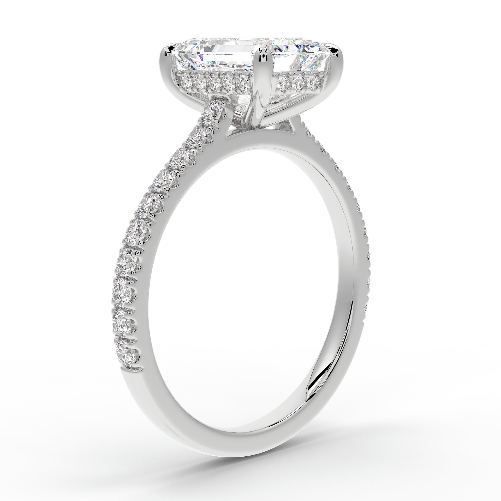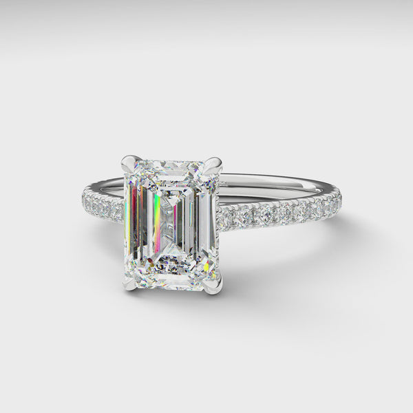 Introducing The Mira Luxe | Emerald Cut Diamond Ring, a stunning fusion of timeless elegance and modern luxury. This exquisite ring showcases an emerald-cut diamond, beautifully set in a classic cathedral design that enhances its brilliance. The diamond is securely held by custom talon claws and surrounded by a hidden halo of diamonds for an extra touch of sparkle. The band is adorned with pave-set diamonds along 60% of the shoulders, adding to the ring’s radiant allure. Key features include a hidden diamond halo, pave-set shoulders, and a refined cathedral setting.