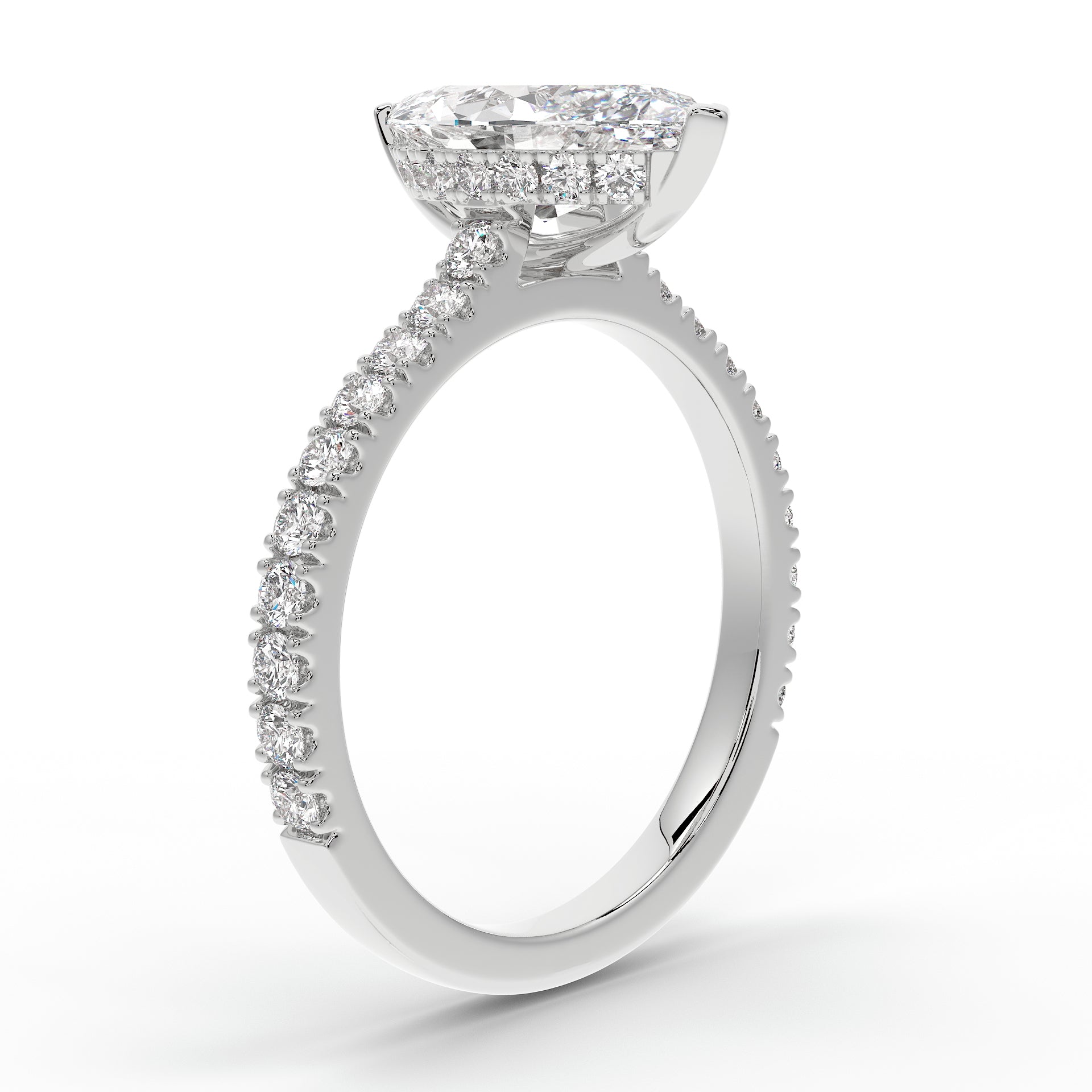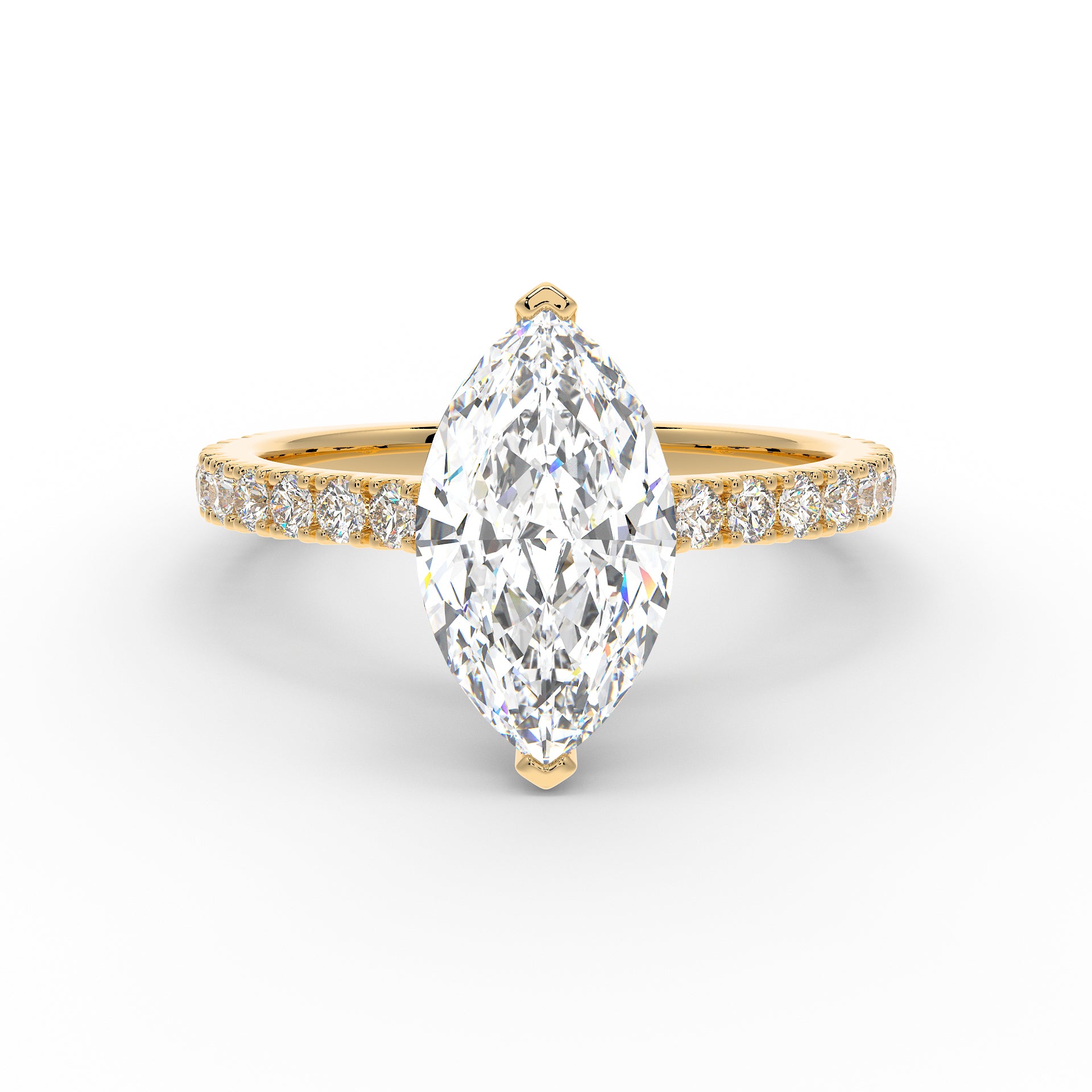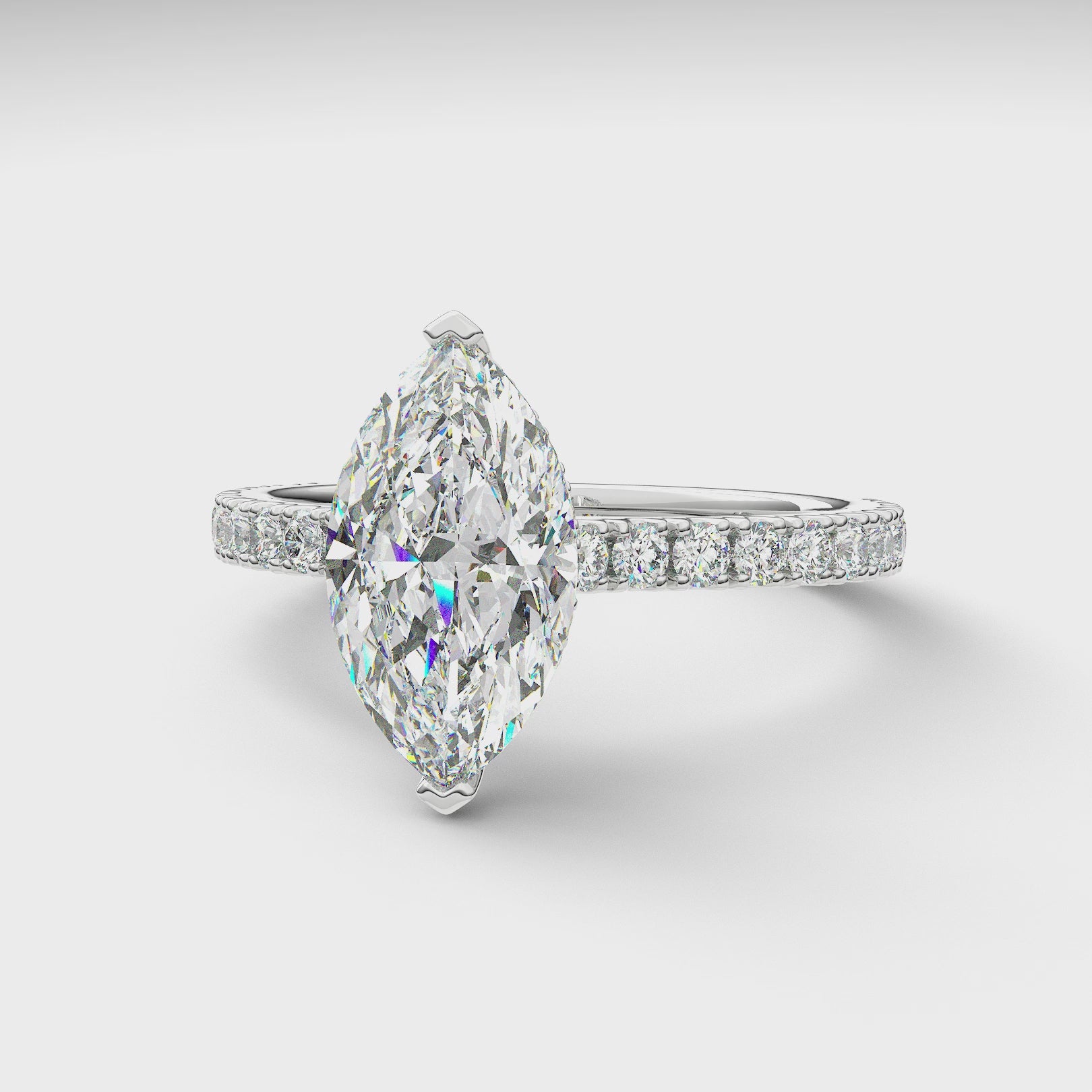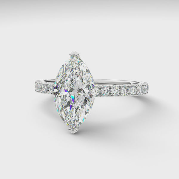 Introducing The Mira Luxe | Marquise Cut Diamond Ring, a stunning fusion of timeless elegance and modern luxury. This exquisite ring features a marquise-cut diamond, beautifully set in a classic cathedral design that enhances its brilliance. The diamond is securely held by custom talon claws and surrounded by a hidden halo of diamonds for an extra touch of sparkle. The band is adorned with pave-set diamonds along 60% of the shoulders, adding to the ring’s radiant allure. Key features include a hidden diamond halo, pave-set shoulders, and a refined cathedral setting.