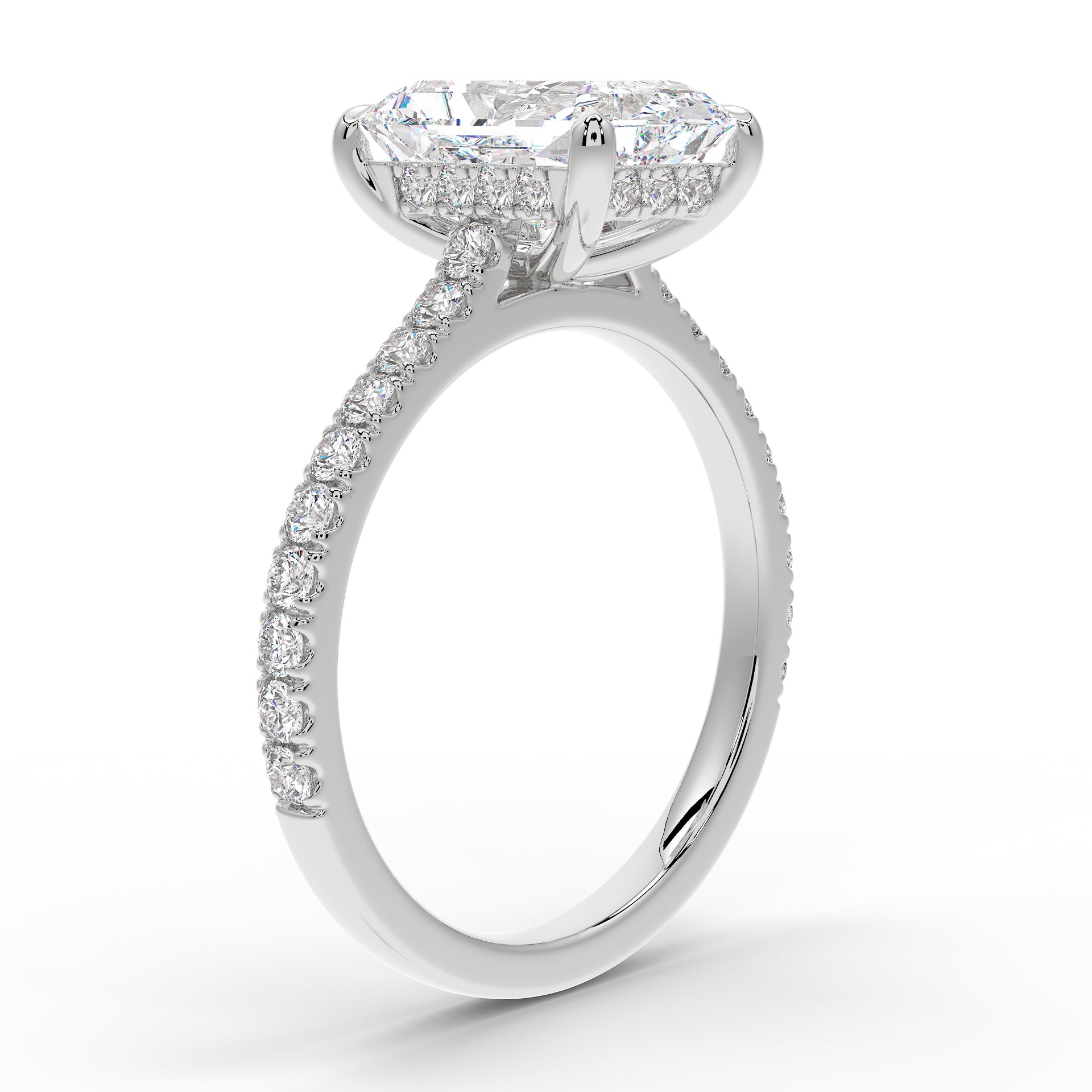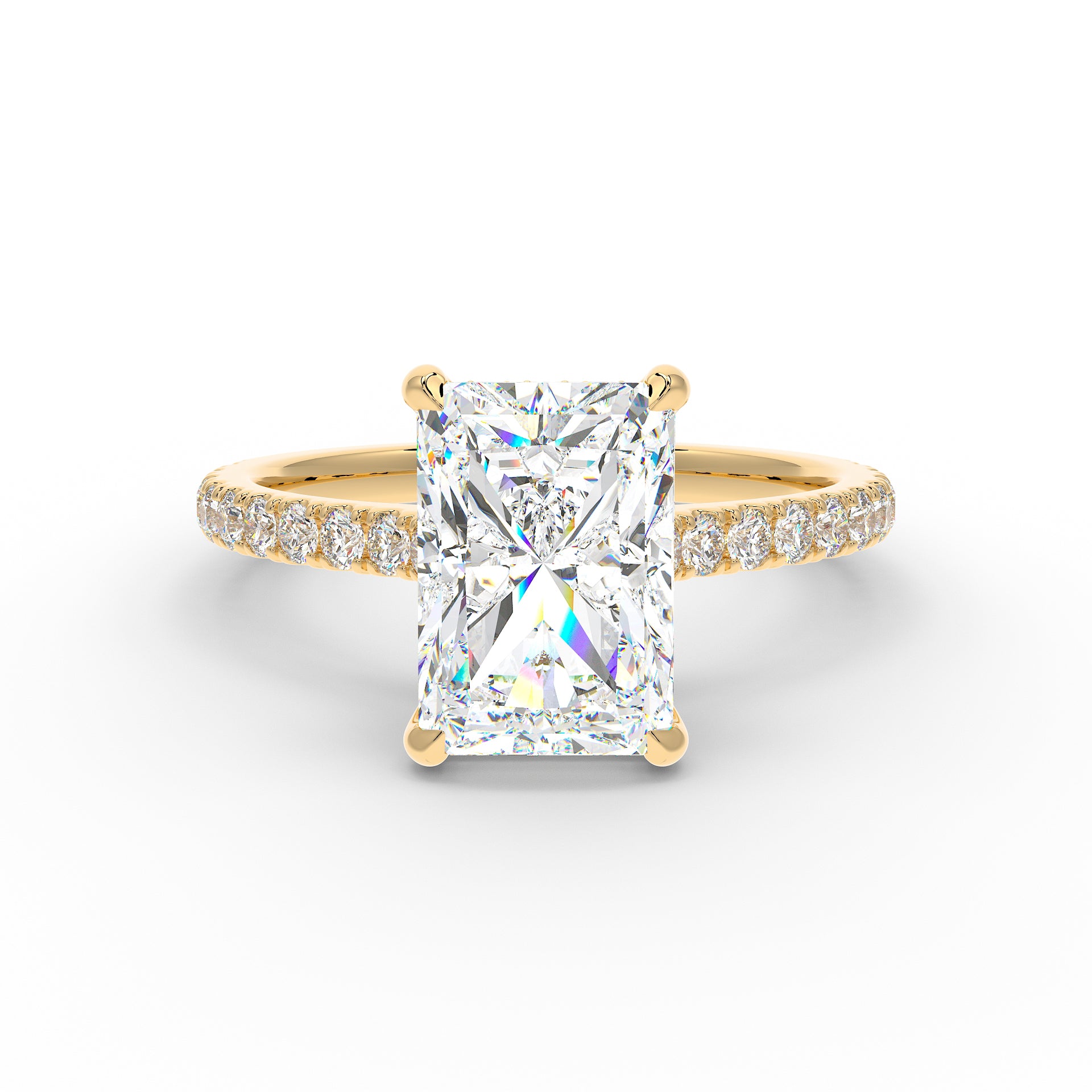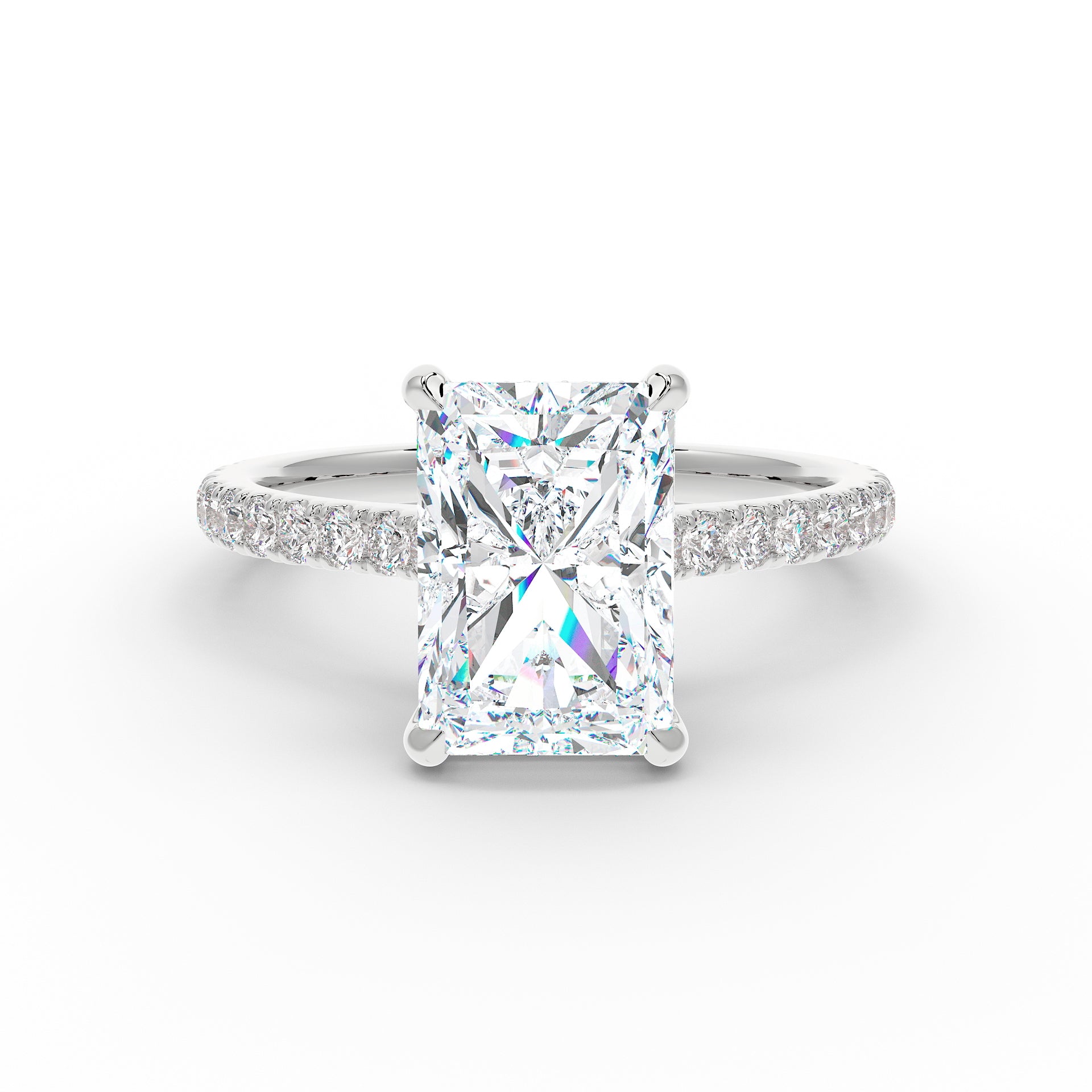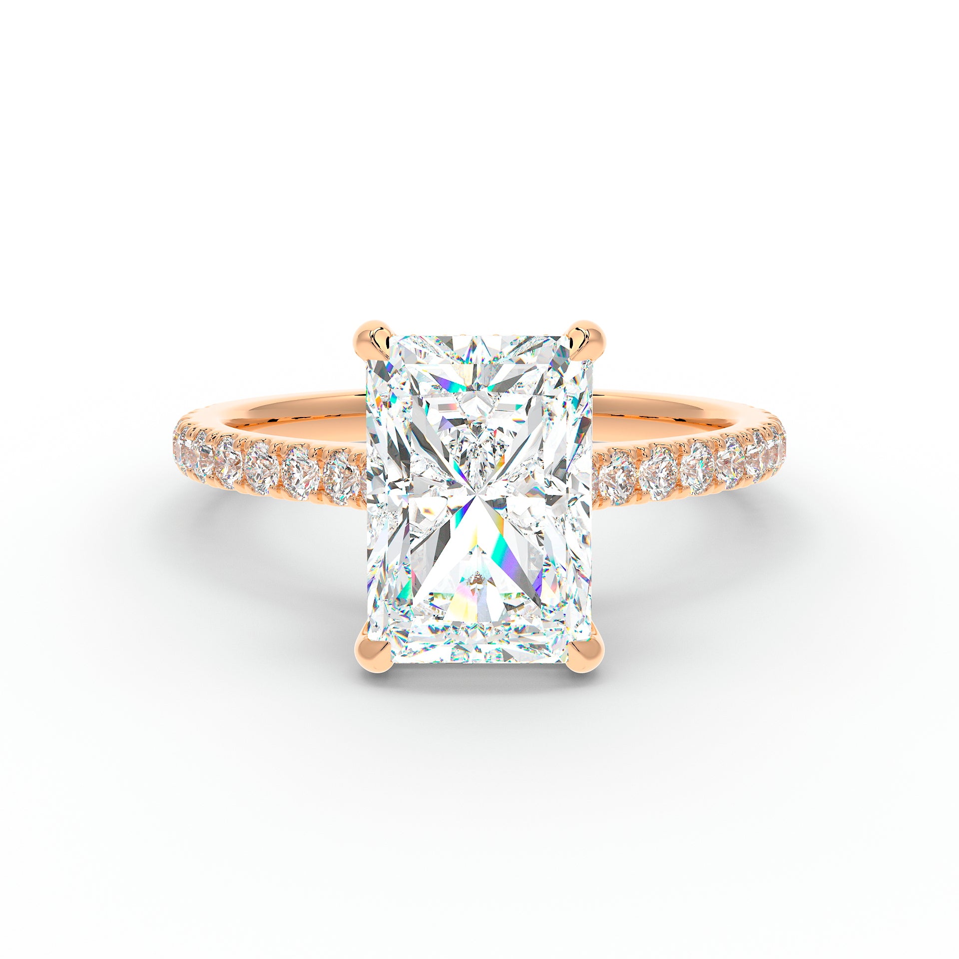 Introducing The Mira Luxe | Radiant Cut Diamond Ring, a stunning fusion of timeless elegance and modern luxury. This exquisite ring features a radiant-cut diamond, beautifully set in a classic cathedral design that enhances its brilliance. The diamond is securely held by custom talon claws and surrounded by a hidden halo of diamonds for an extra touch of sparkle. The band is adorned with pave-set diamonds along 60% of the shoulders, adding to the ring’s radiant allure. Key features include a hidden diamond halo, pave-set shoulders, and a refined cathedral setting.