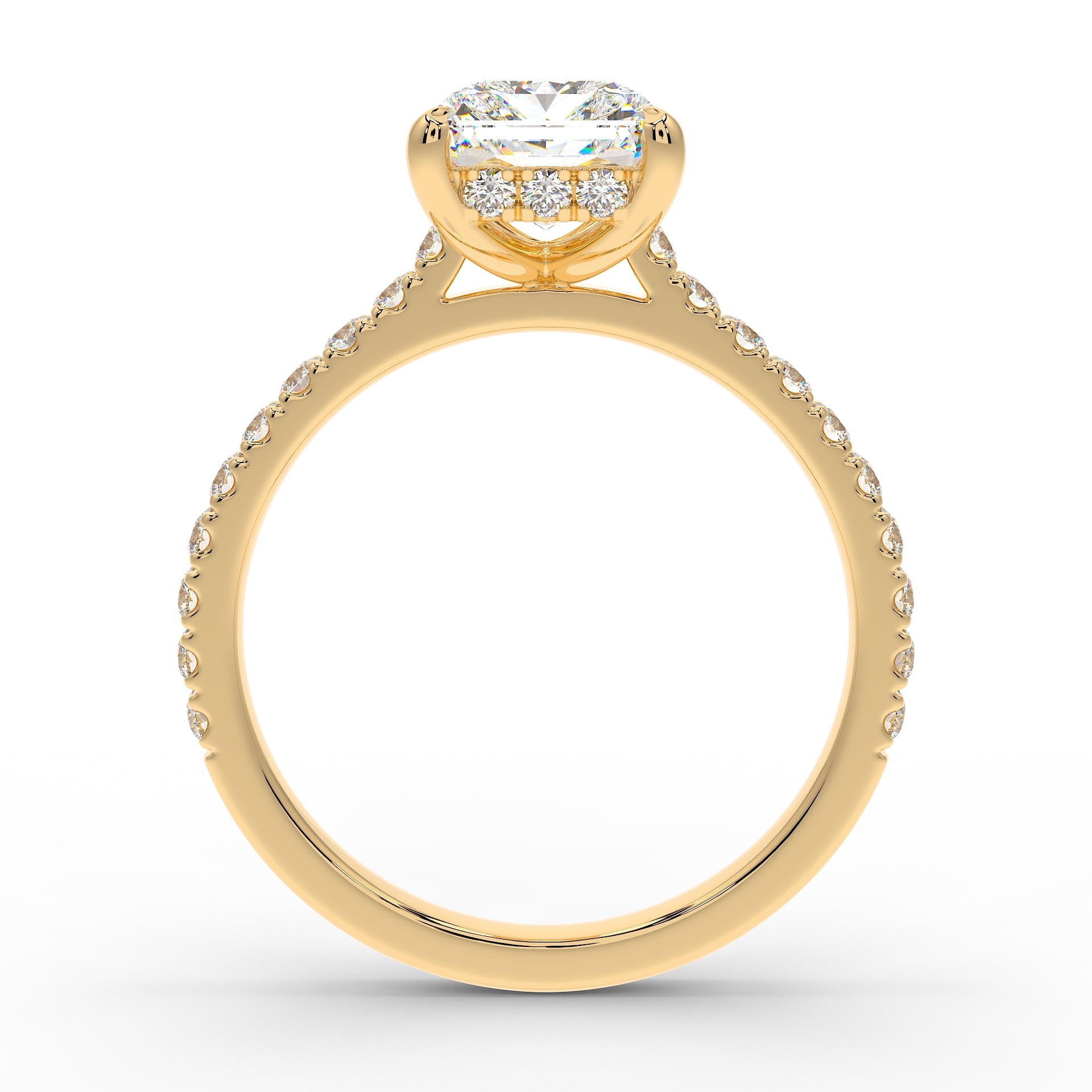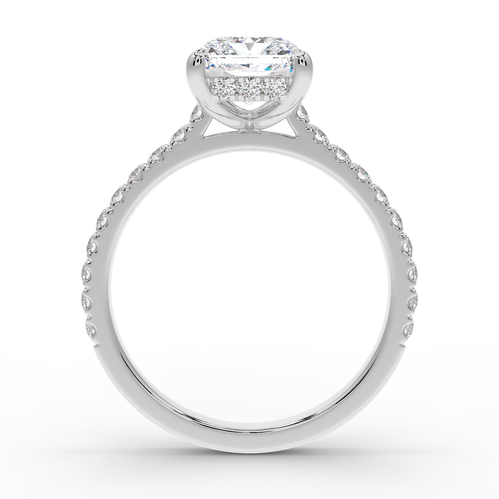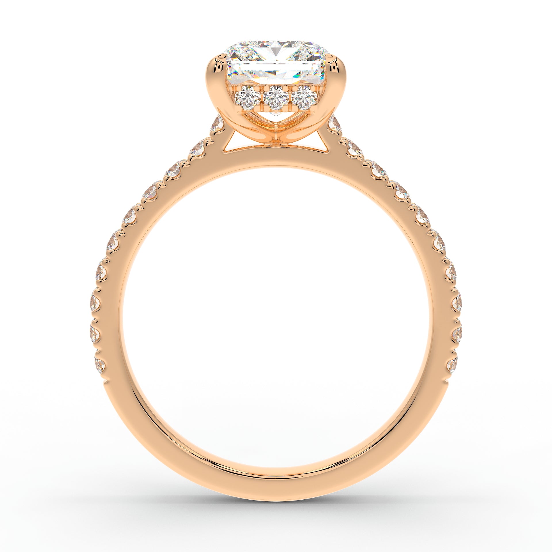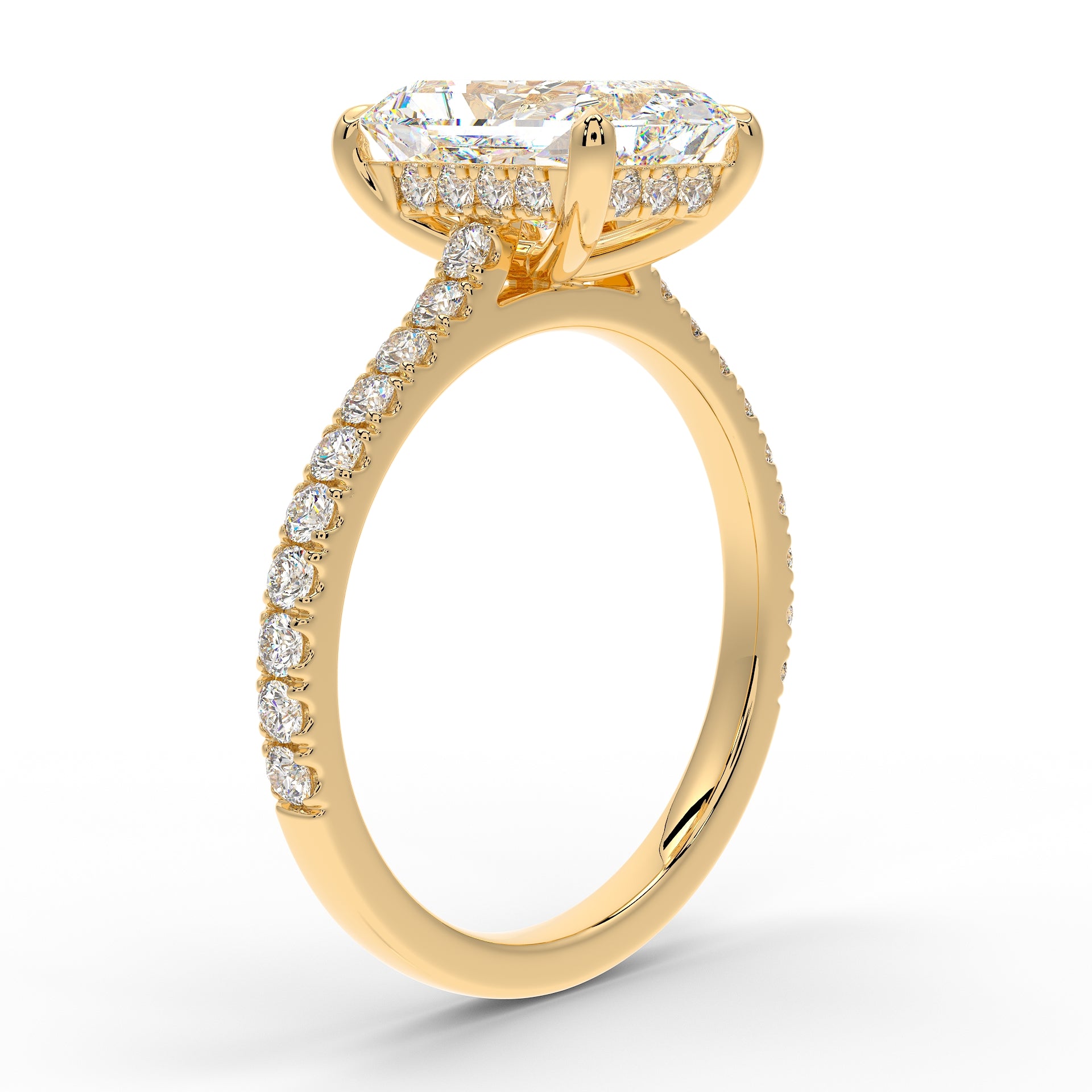 Introducing The Mira Luxe | Radiant Cut Diamond Ring, a stunning fusion of timeless elegance and modern luxury. This exquisite ring features a radiant-cut diamond, beautifully set in a classic cathedral design that enhances its brilliance. The diamond is securely held by custom talon claws and surrounded by a hidden halo of diamonds for an extra touch of sparkle. The band is adorned with pave-set diamonds along 60% of the shoulders, adding to the ring’s radiant allure. Key features include a hidden diamond halo, pave-set shoulders, and a refined cathedral setting.