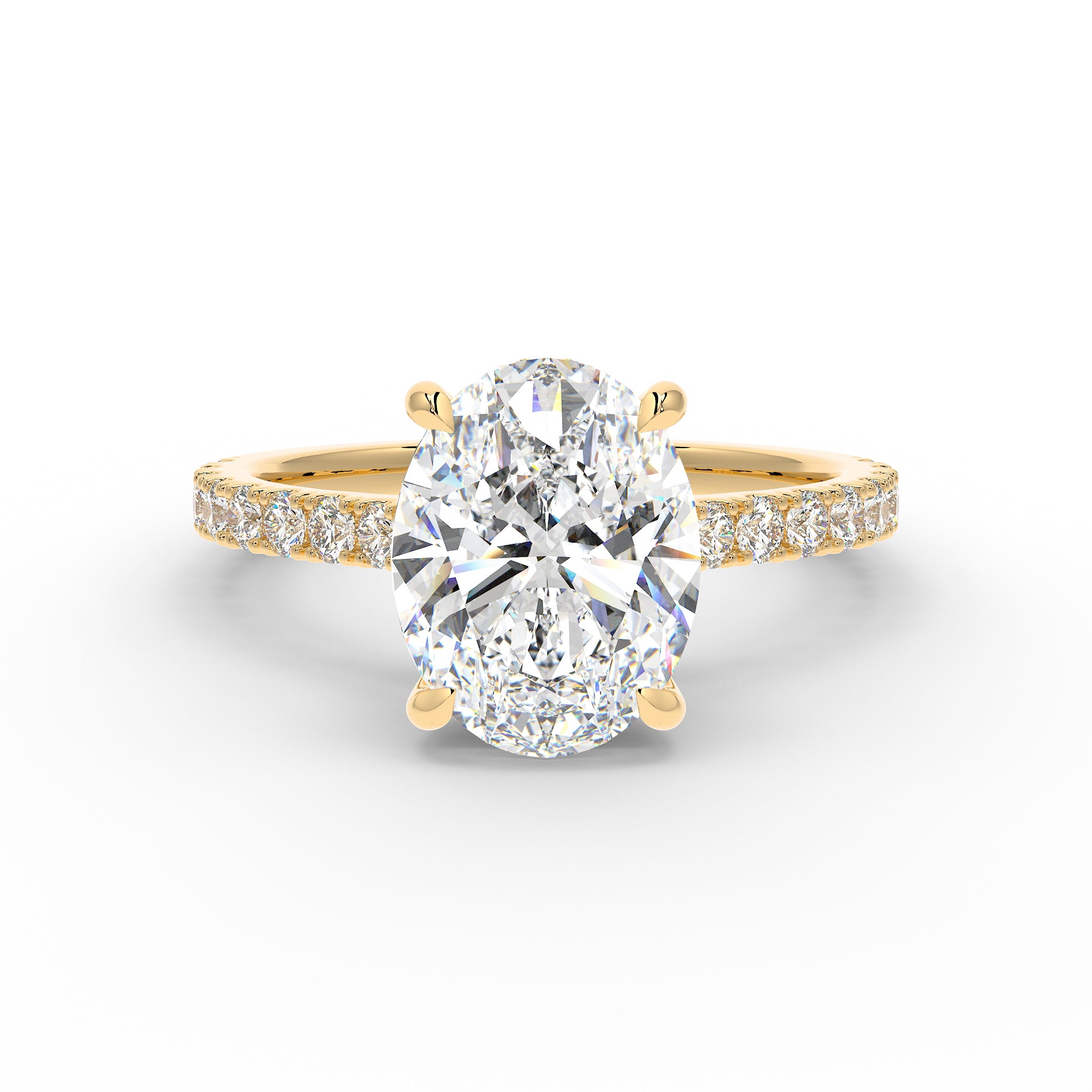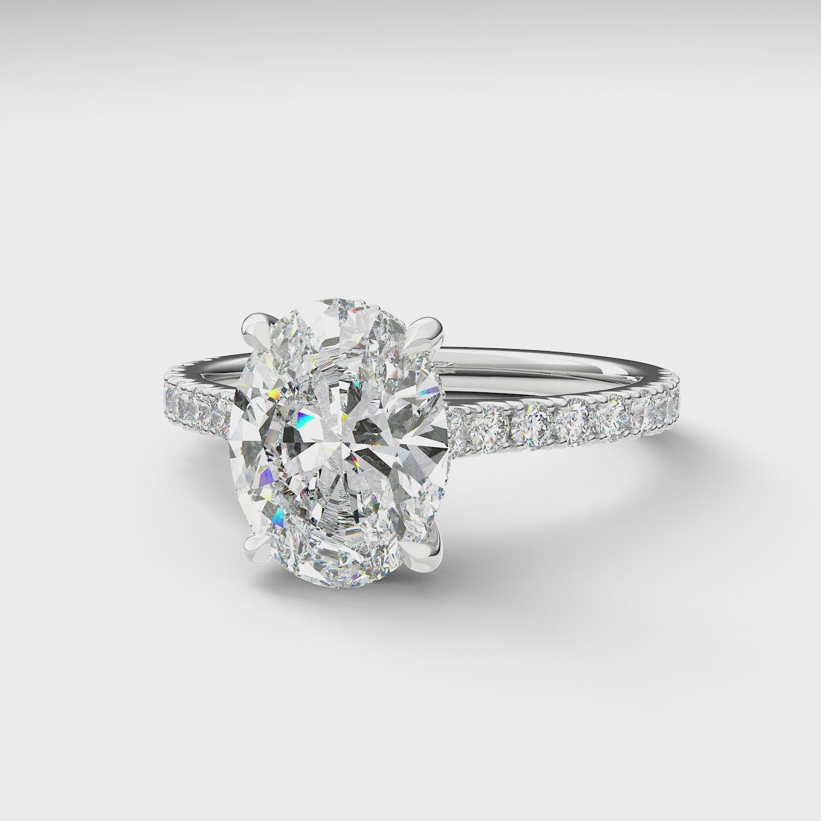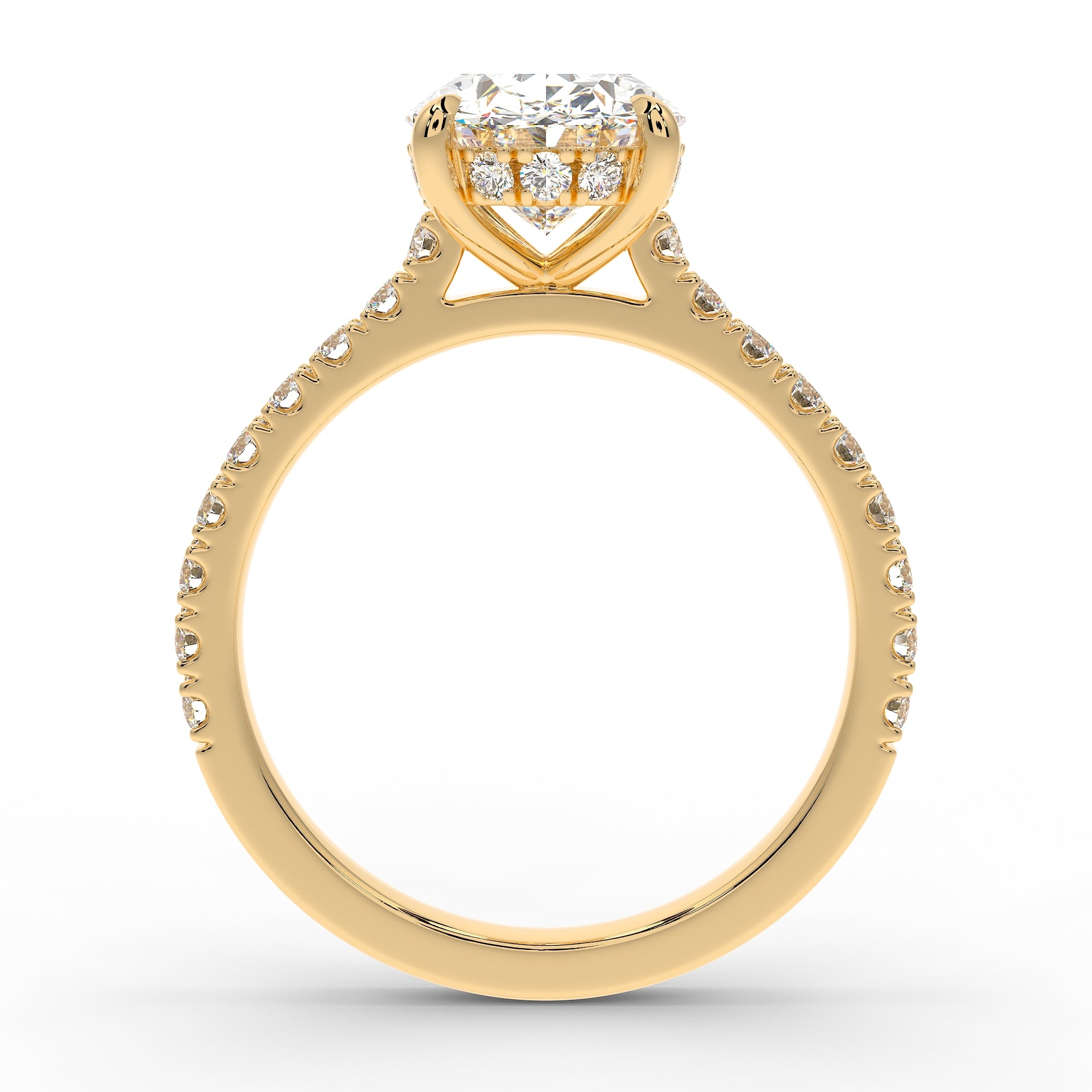 Introducing The Mira Luxe | Oval Cut Diamond Ring, a stunning fusion of timeless elegance and modern luxury. This exquisite ring features an oval-cut diamond, beautifully set in a classic cathedral design that enhances its brilliance. The diamond is securely held by custom talon claws and surrounded by a hidden halo of diamonds for an extra touch of sparkle. The band is adorned with pave-set diamonds along 60% of the shoulders, adding to the ring’s radiant allure. Key features include a hidden diamond halo, pave-set shoulders, and a refined cathedral setting.