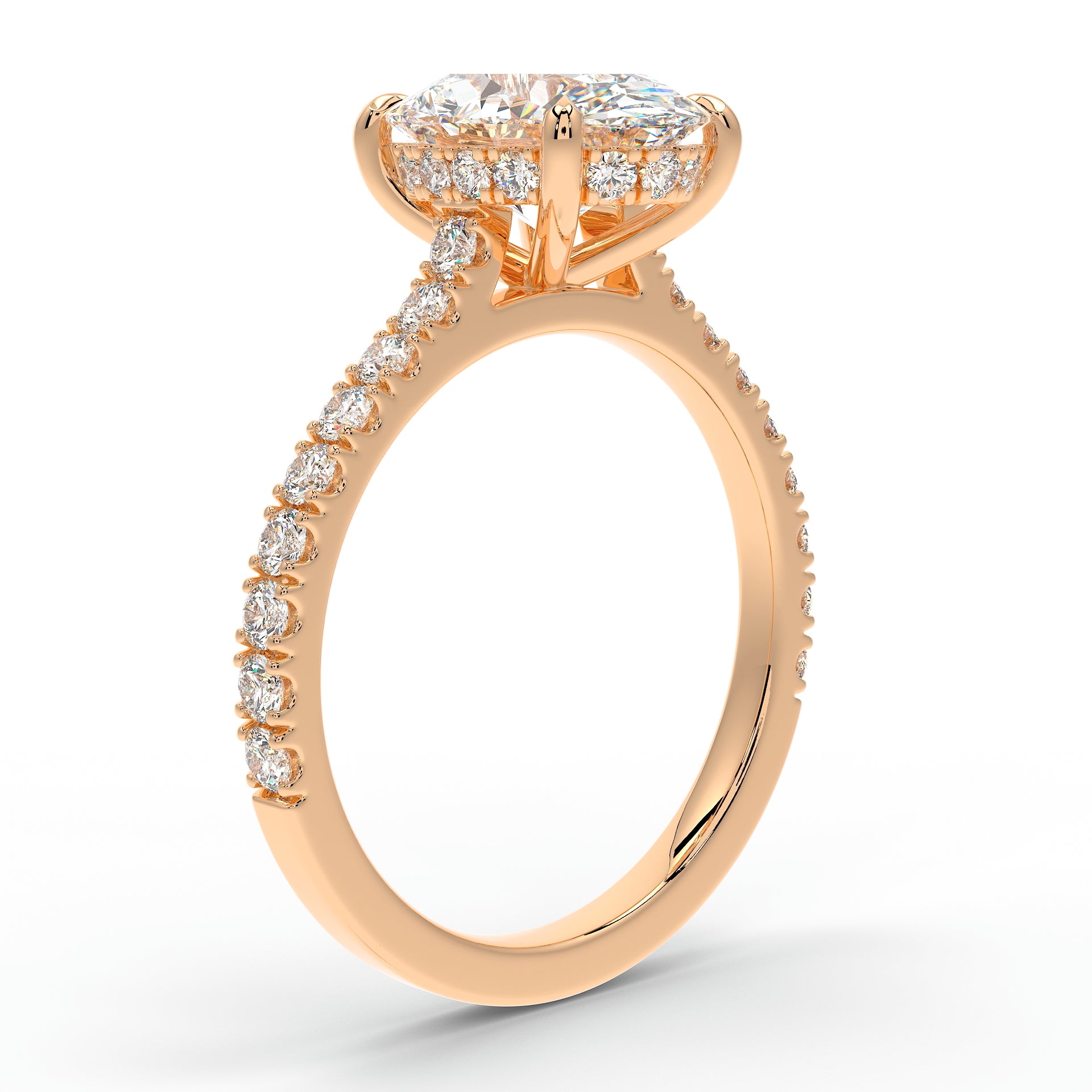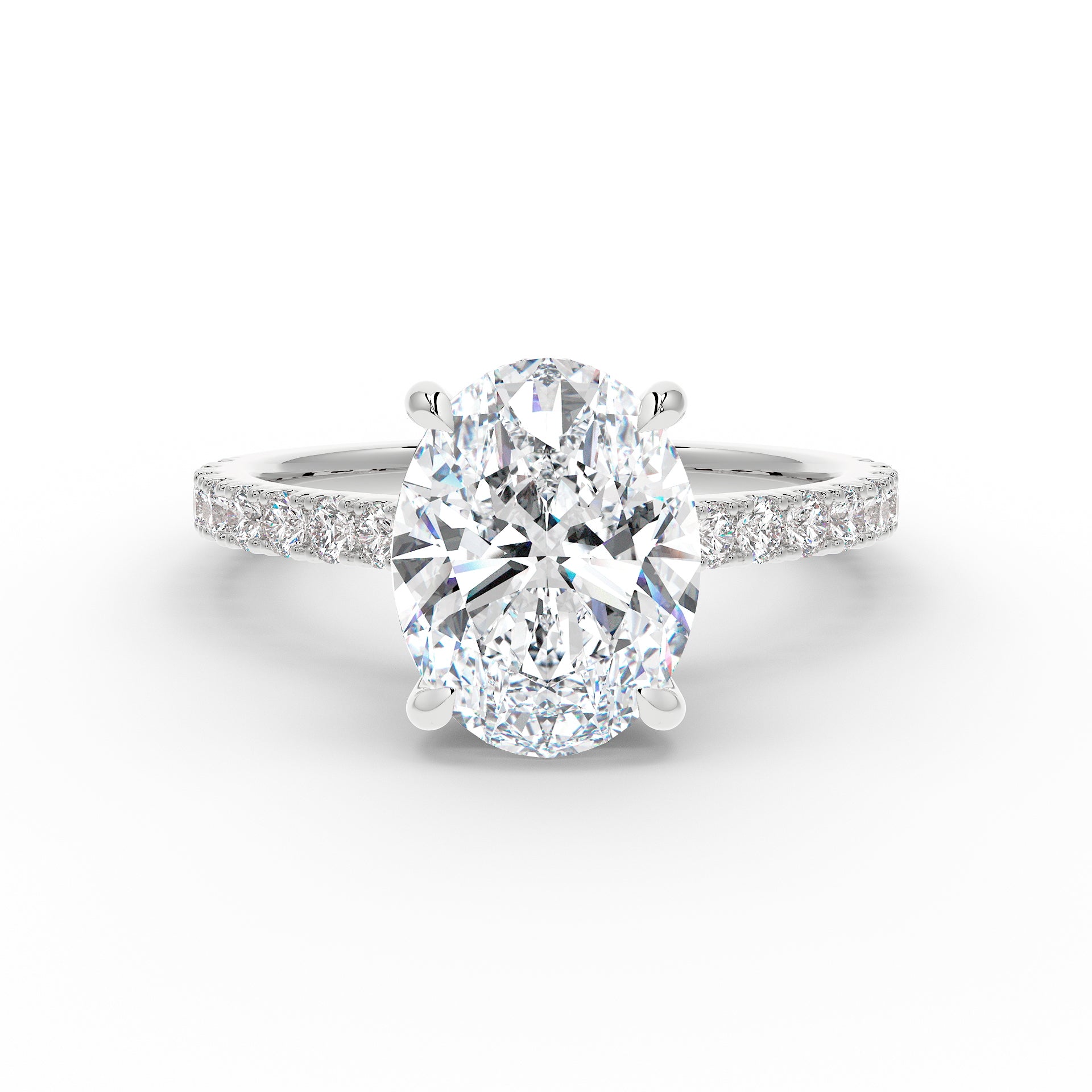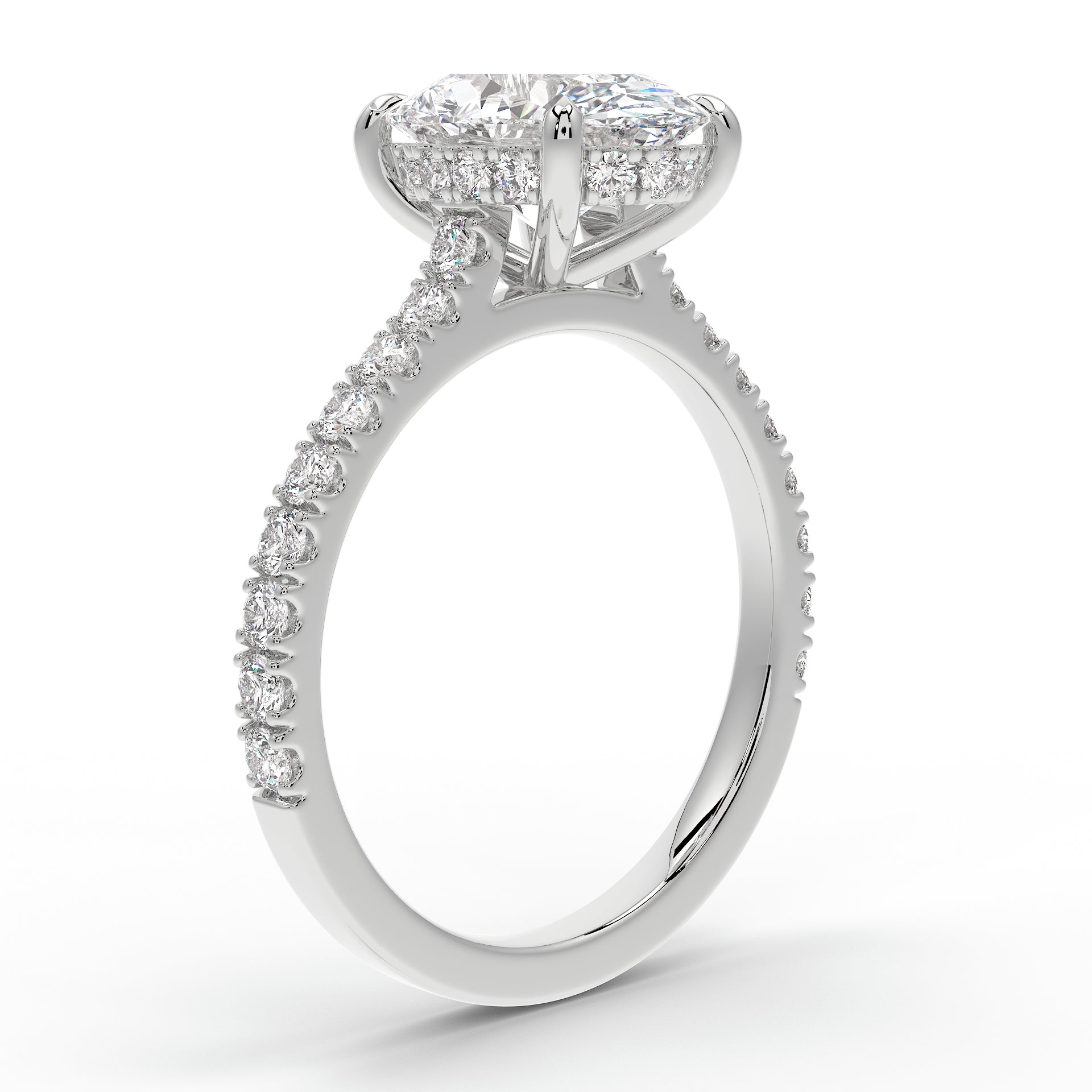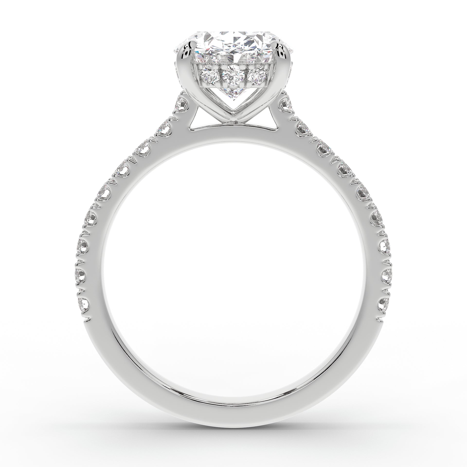 Introducing The Mira Luxe | Oval Cut Diamond Ring, a stunning fusion of timeless elegance and modern luxury. This exquisite ring features an oval-cut diamond, beautifully set in a classic cathedral design that enhances its brilliance. The diamond is securely held by custom talon claws and surrounded by a hidden halo of diamonds for an extra touch of sparkle. The band is adorned with pave-set diamonds along 60% of the shoulders, adding to the ring’s radiant allure. Key features include a hidden diamond halo, pave-set shoulders, and a refined cathedral setting.