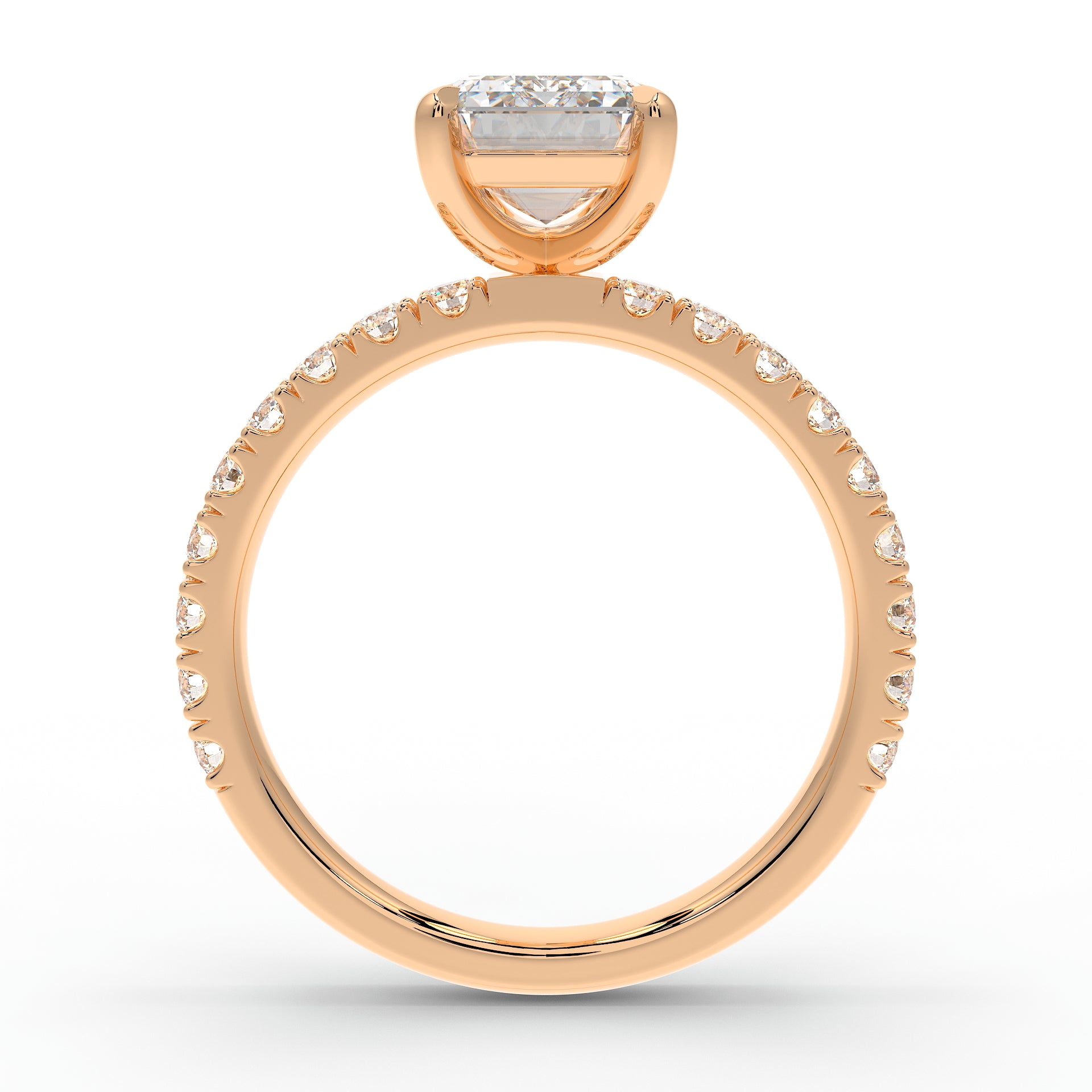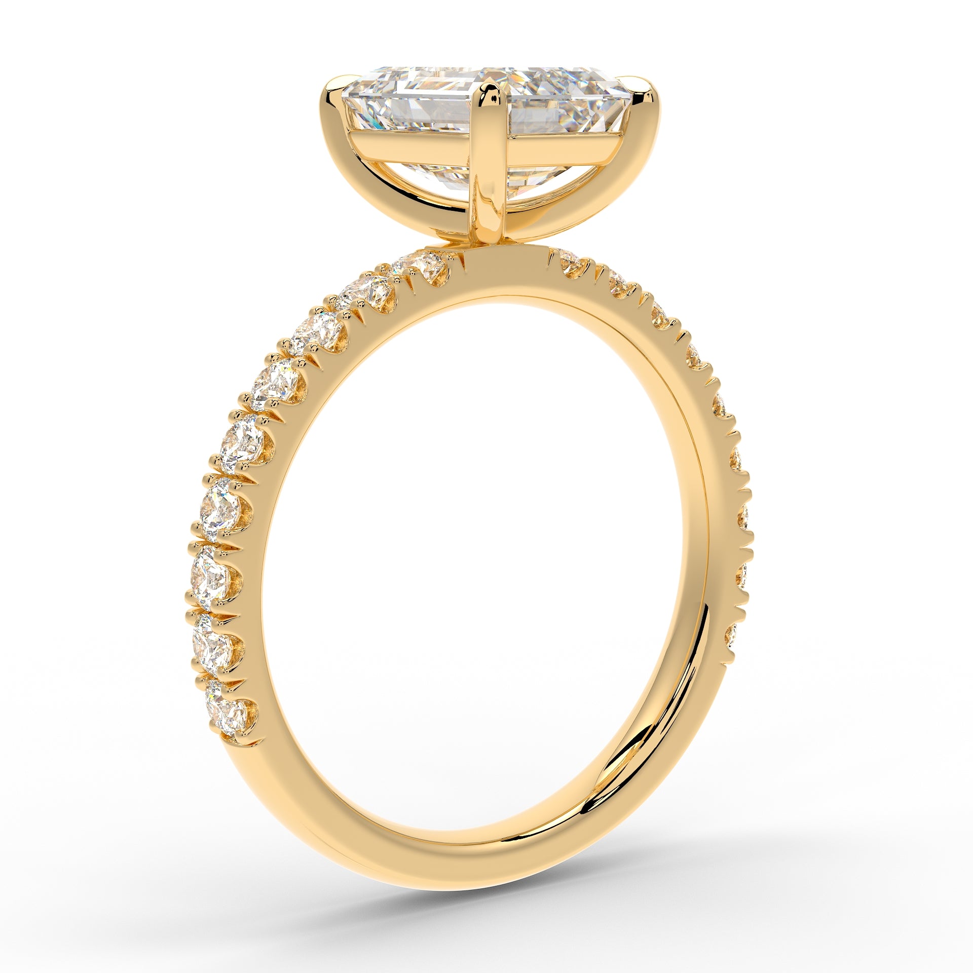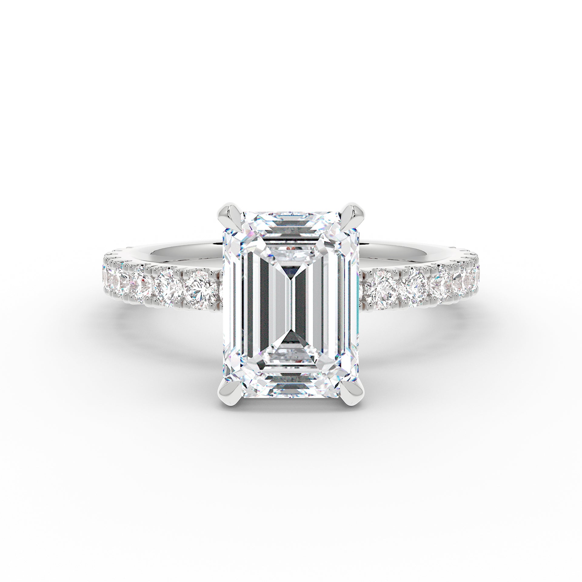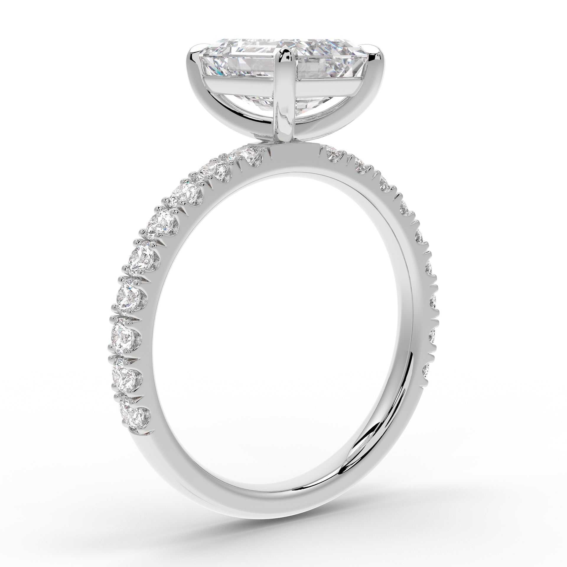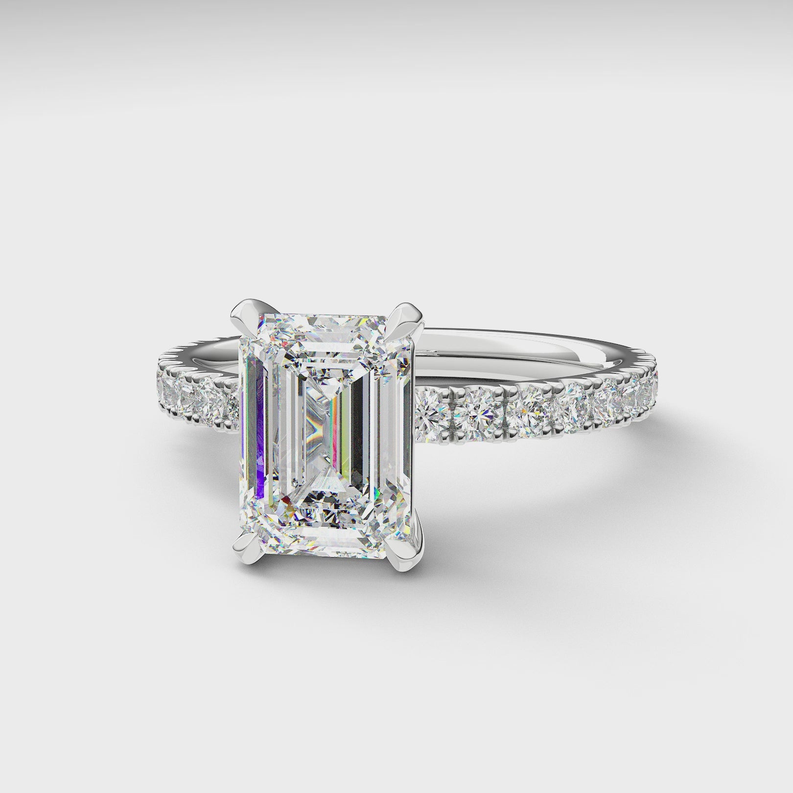 Introducing The Nova Pave | Emerald Cut Diamond Ring, a masterpiece of modern elegance and sophistication. This stunning engagement ring features an emerald-cut diamond, beautifully set in a floating design with custom talon claws that add a unique touch of refinement. The diamond is further accentuated by pave diamond shoulders, intricately set along 60% of the band, offering an exquisite sparkle. Available in a range of metal options, including white gold, yellow gold, rose gold, and platinum, The Nova Pave can be customised to suit your individual style. With its secure setting and floating design, this ring is a breathtaking symbol of timeless beauty and contemporary luxury.